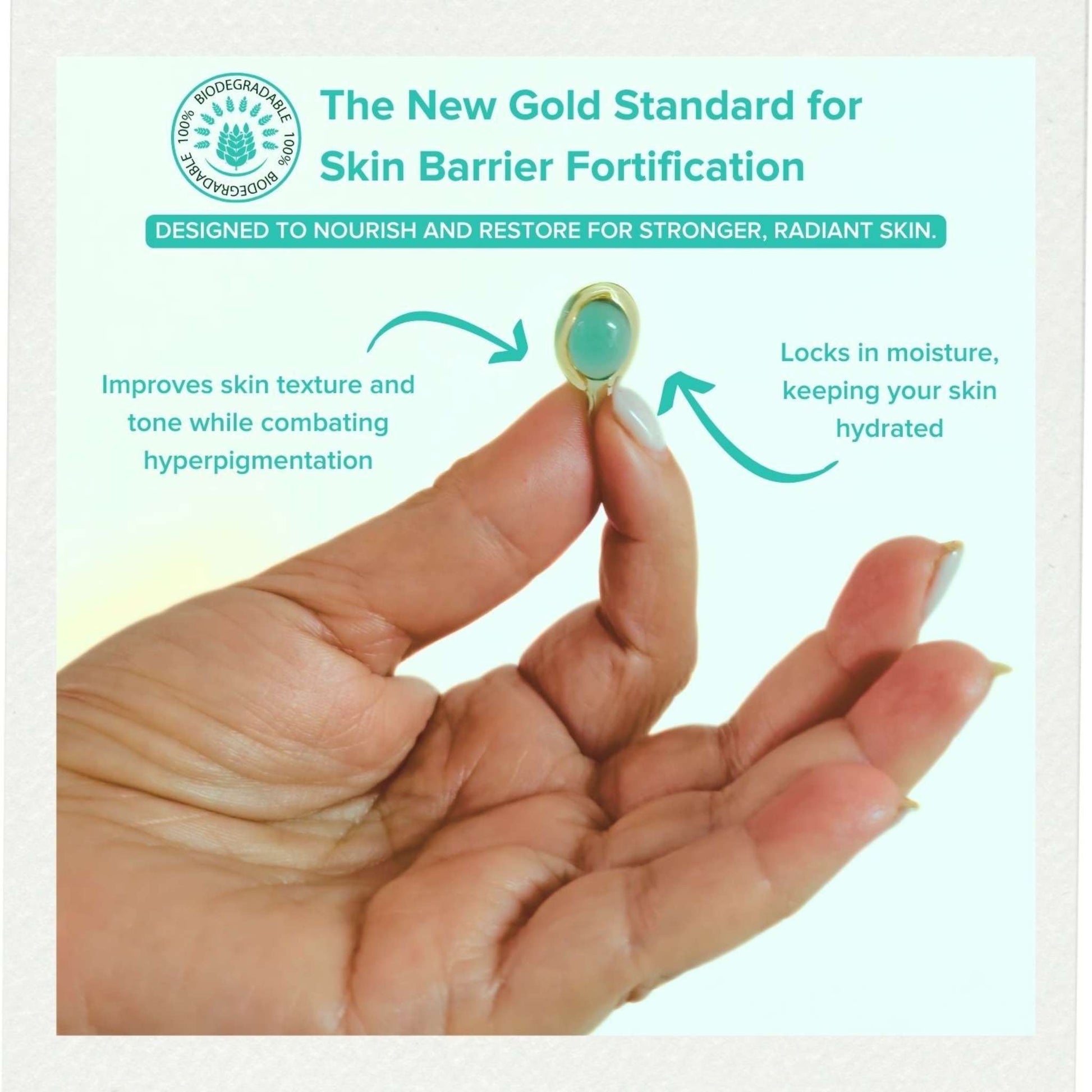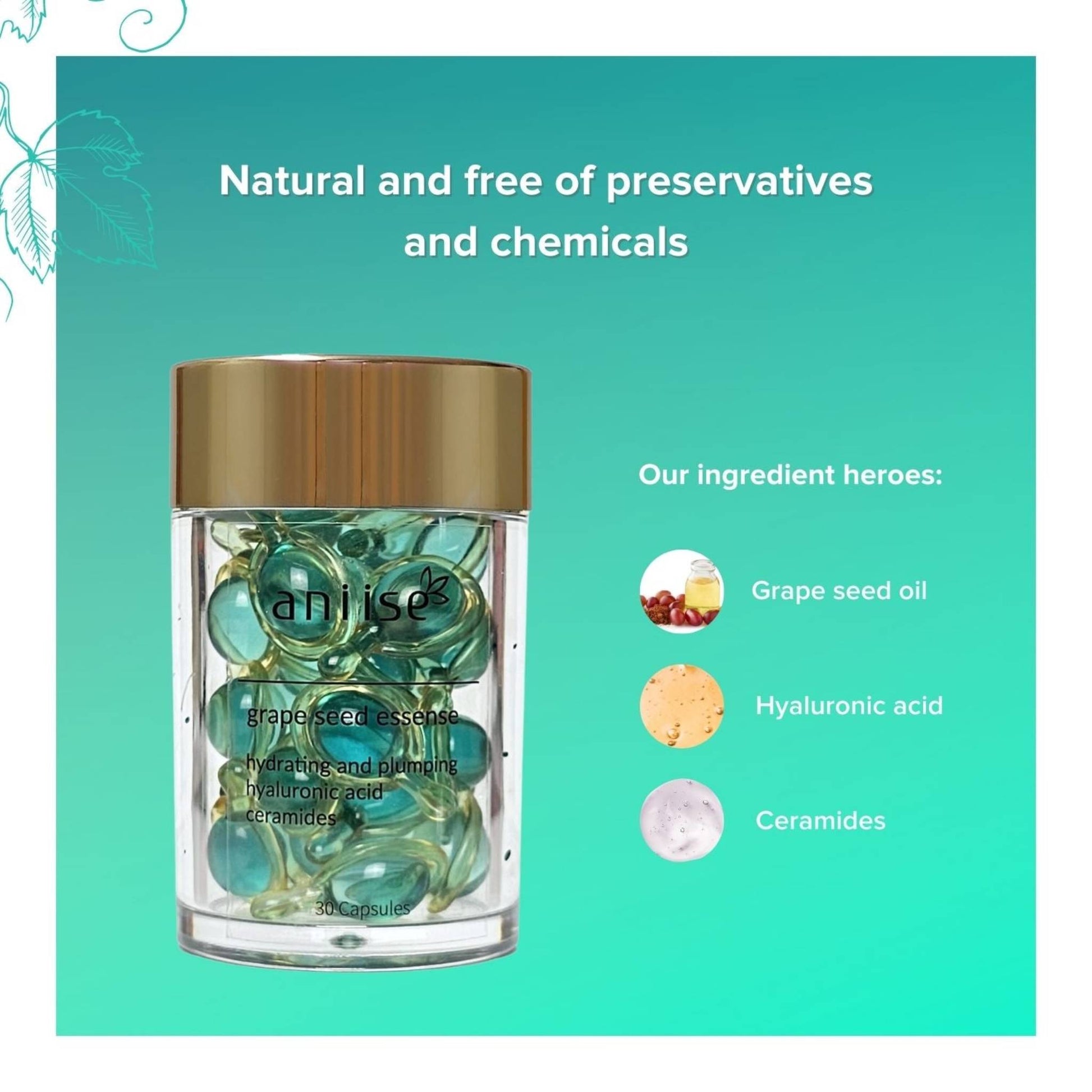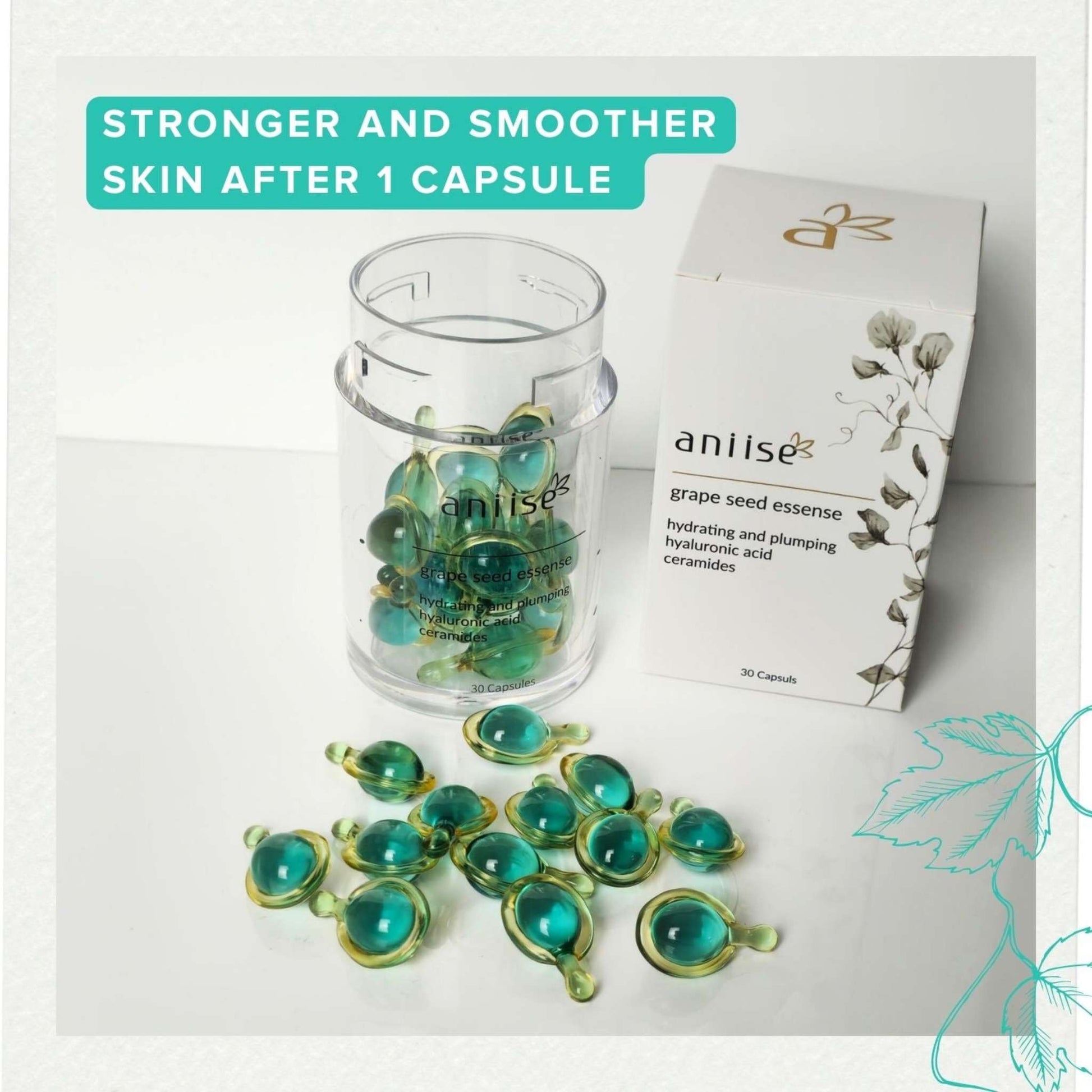Experience the magic of our Grape Seed Oil Ceramide Capsules, your gateway to achieving a radiant and effortlessly youthful complexion! These capsules are designed for all skin types, packed with potent ingredients like Grape Seed Oil, Hyaluronic Acid, and Ceramides. The precision-sealed capsules preserve the product's natural properties while ensuring maximum potency and effectiveness. Plus, they're eco-friendly, being 100% biodegradable.